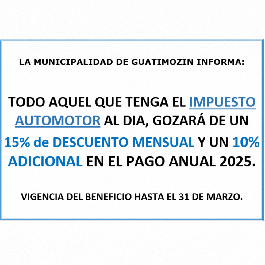 La Municipalidad de Guatimozín anuncia que ya se encuentra vigente el programa de beneficios por buen cumplimiento tributario.