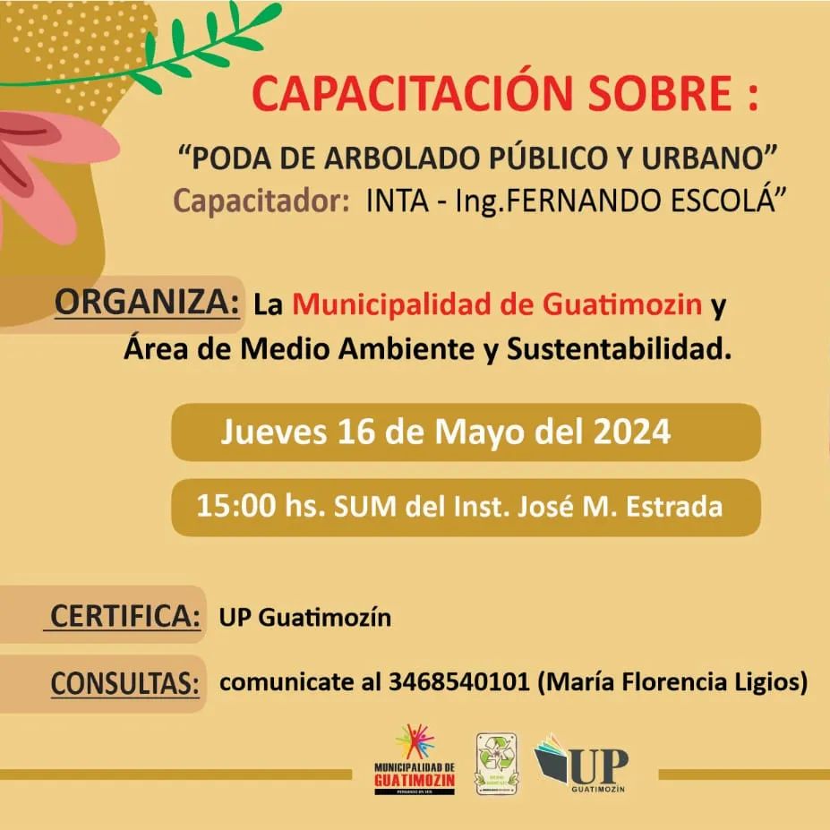 La Municipalidad de Guatimozín, en colaboración con el Área de Medio Ambiente y Sustentabilidad y la Universidad Popular de nuestra comunidad, se complace en anunciar una capacitación especial en Poda de Arbolado Público y Urbano, impartida por el reconocido Ing. Fernando Escolá del INTA.