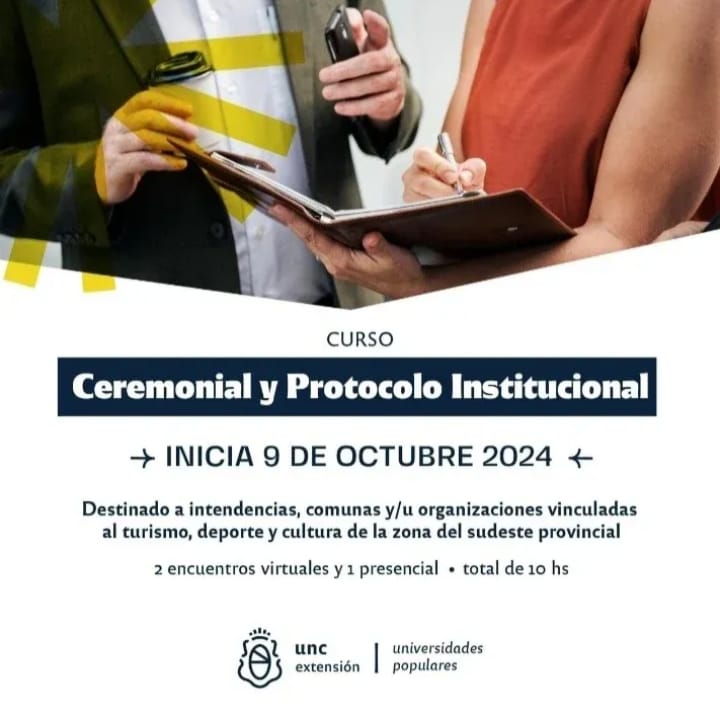 Curso de Ceremonial y Protocolo Institucional, de la Municipalidad de Guatimozín: — ¡Inscribete al Curso de Ceremonial y Protocolo Institucional en Guatimozín! ¿Te gustaría mejorar tu perfil profesional? ¿Y acceder a nuevas oportunidades laborales? La Municipalidad de Guatimozín te invita a participar del Curso de Ceremonial y Protocolo Institucional, una formación esencial para dominar las normas y técnicas que rigen los eventos y actos oficiales en municipios, comunas o instituciones. ¿Por qué inscribirte? – Mejora tu empleabilidad: Aprende las claves del ceremonial y protocolo, habilidades que son cada vez más valoradas en el ámbito institucional. – Enriquecé tu perfil profesional: Potenciá tu gestión en cualquier entorno institucional o corporativo, desde la organización de eventos hasta la correcta disposición de autoridades y uso de símbolos patrióticos. – Certificado oficial: Al finalizar el curso, recibirás un certificado que acreditará tus conocimientos y te abrirá nuevas puertas en el mercado laboral.