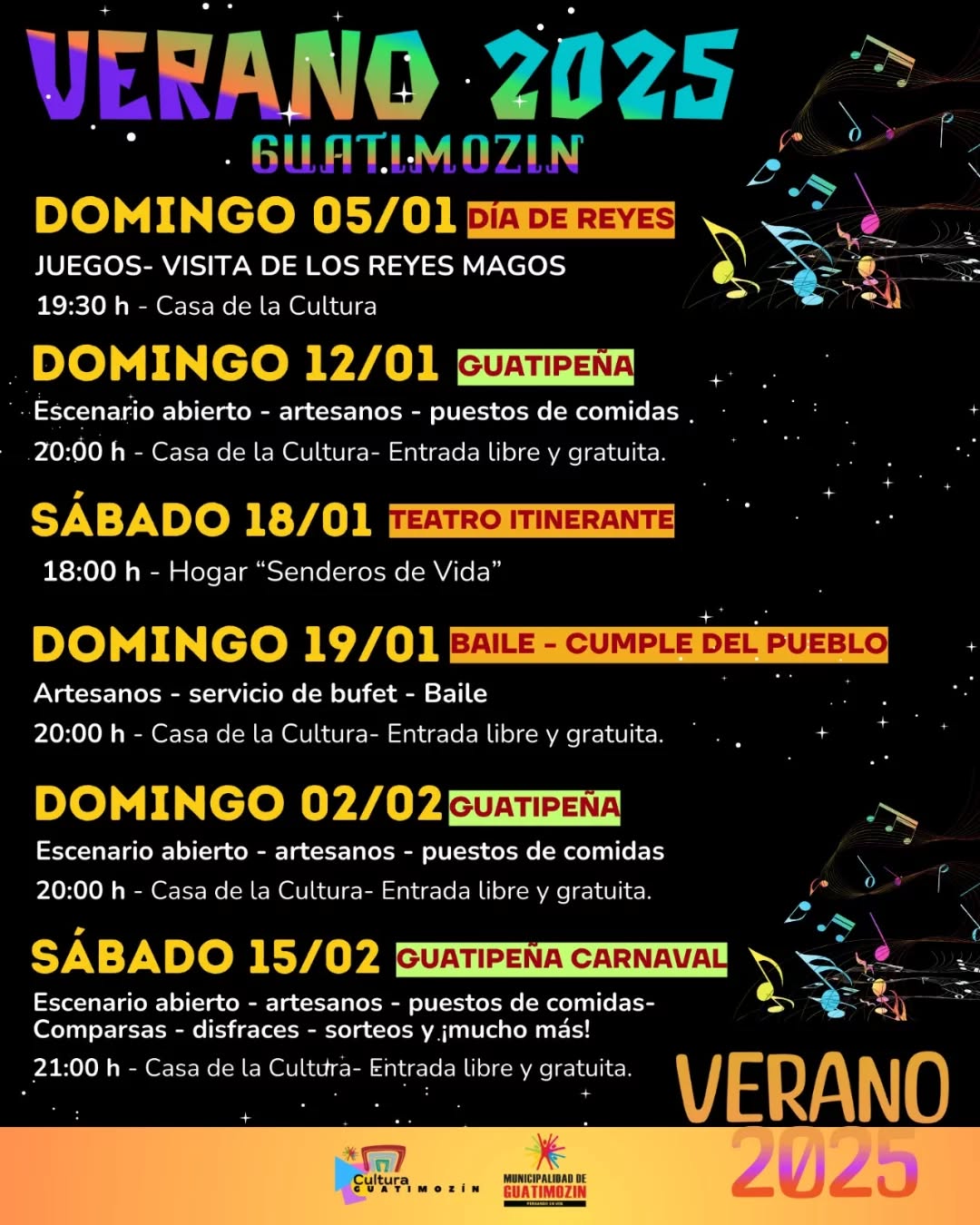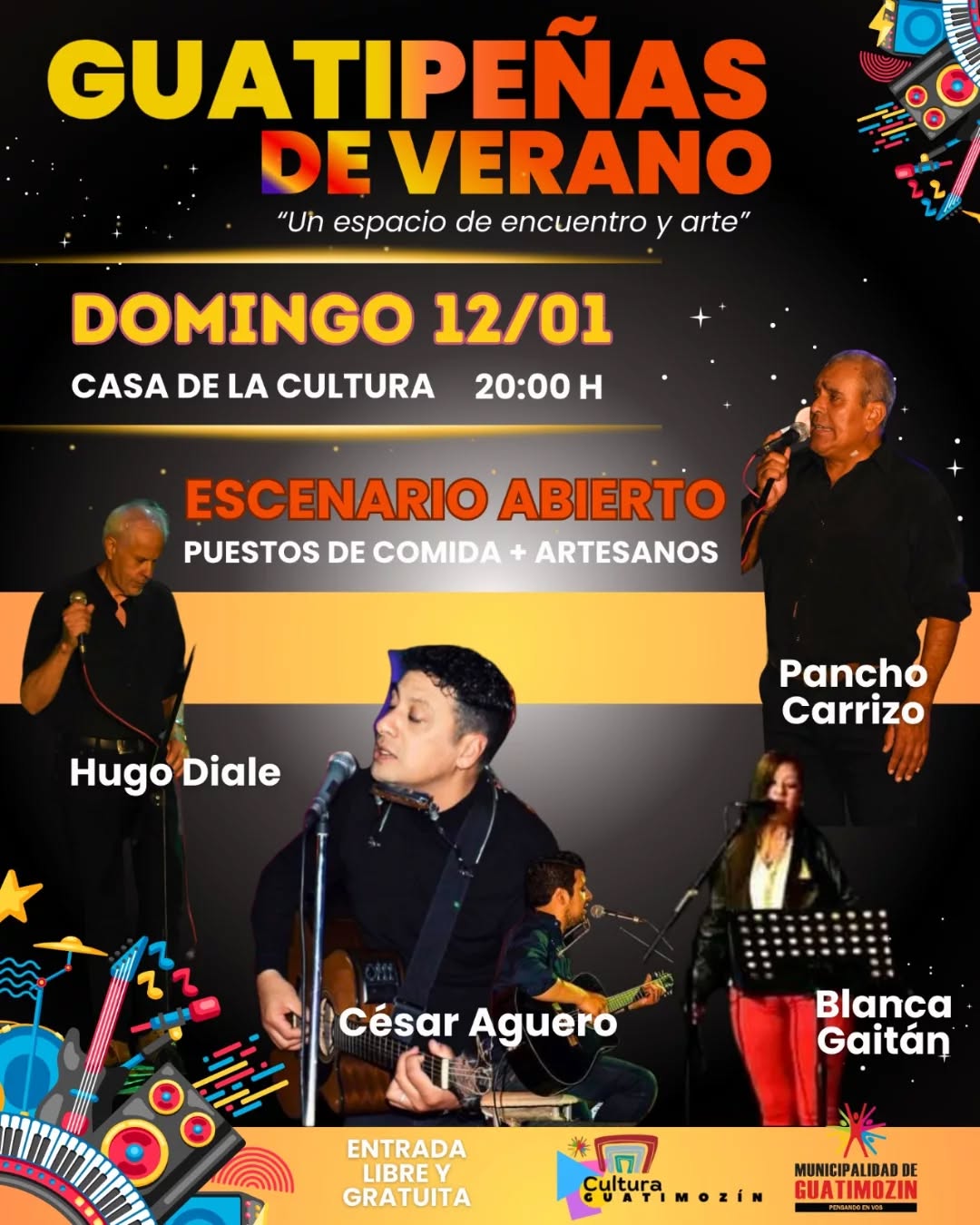 La Municipalidad de Guatimozín te invita a disfrutar de una temporada de verano inolvidable con una programación repleta de música, arte y actividades para toda la familia. Verano 2025 llega con eventos que promueven el encuentro, la diversión y el talento local.